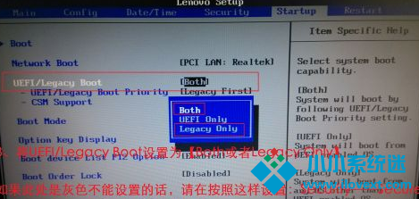 5.选择Startup标签,找到UEFI/Legacy Boot选项按回车键选择Both或者Legacy Only,
