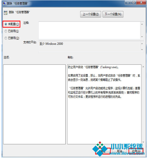 3、接着勾选“未配置”,再点击下方“应用-确定”即可。