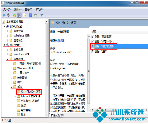 2、在弹出的本地组策略编辑器中,依次点开“用户配置-管理模板-系统-ctrl+alt+del选项”然后再双击右框中的“删除‘任务管理器’”。